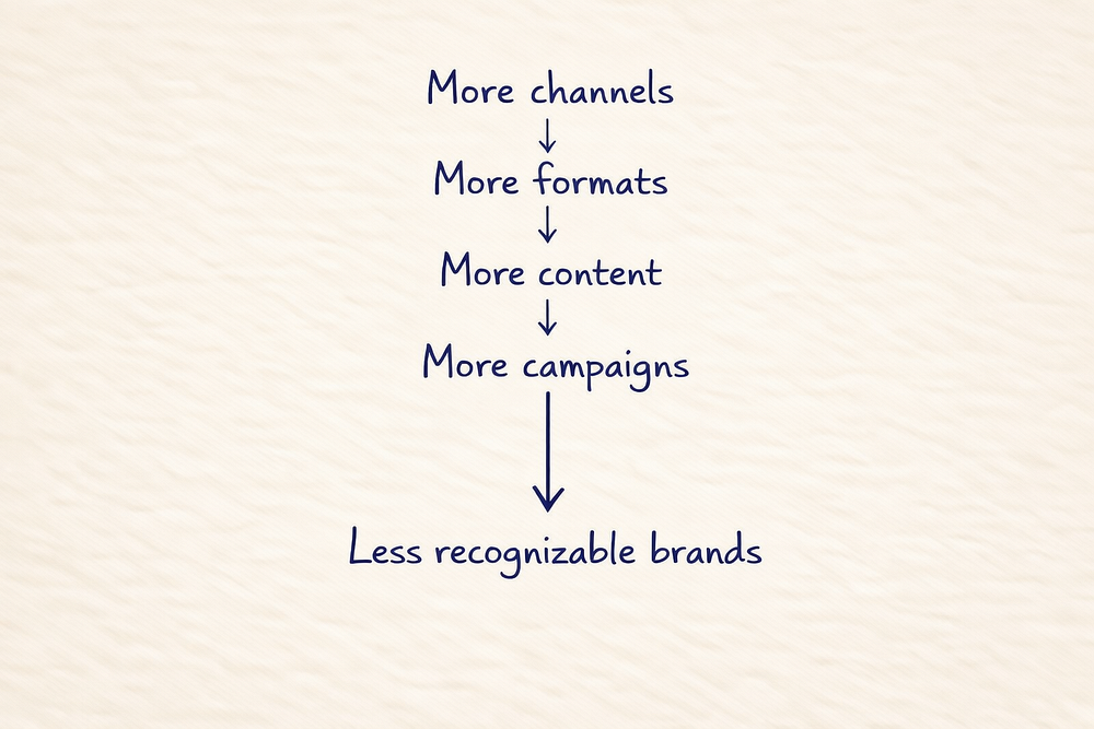 The brand speaks constantly, yet its voice never becomes recognizable.