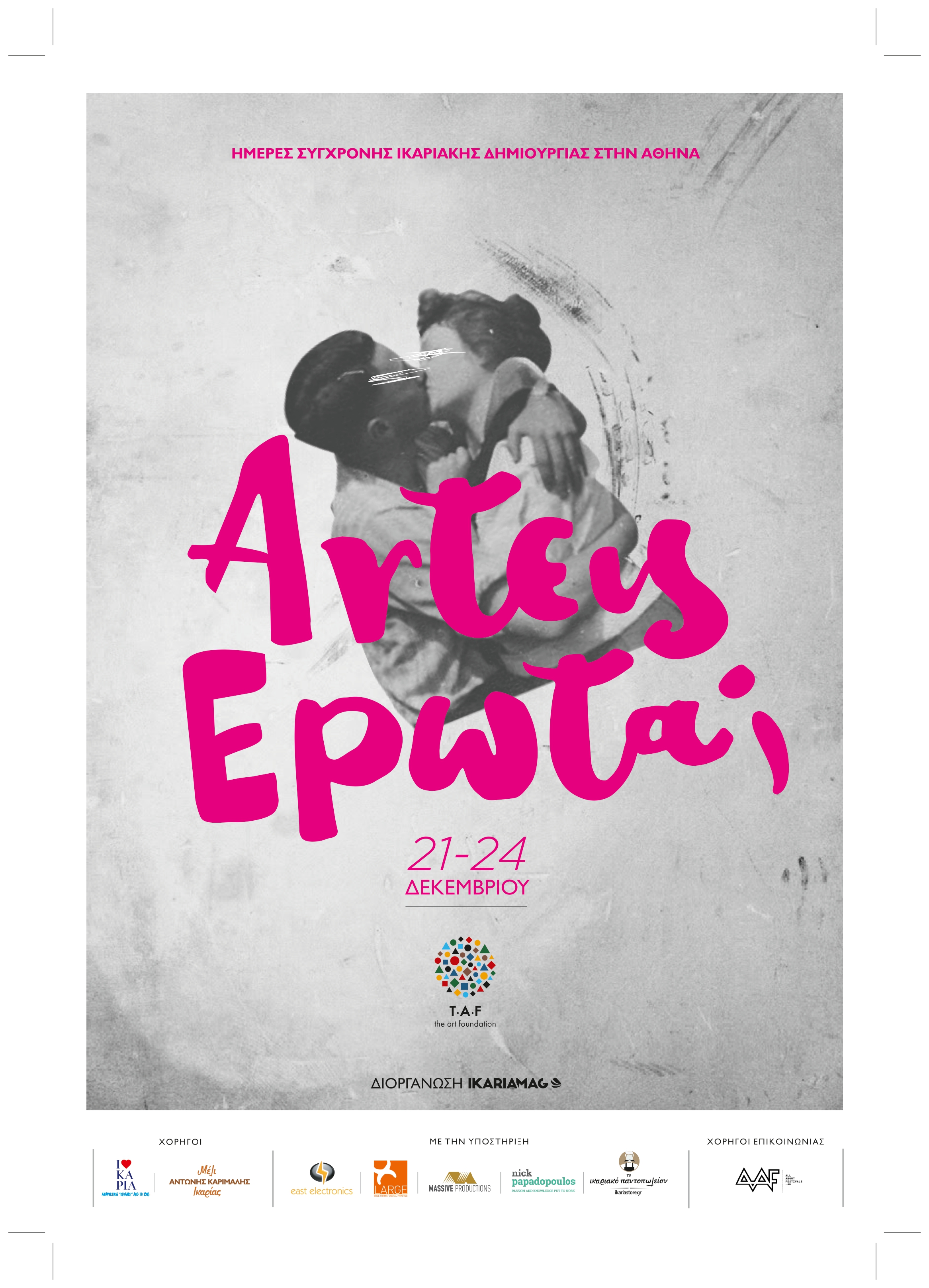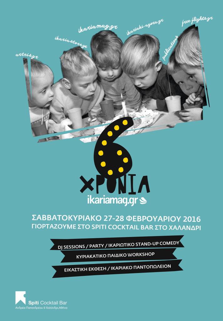 Artεις; fest was a multifaceted venture of ours. A multi-day multimedia festival in the heart of Athens. At the beginning, exhibitions of Icarians or Icarian themes were hosted, but over time it became an occasion for artist and creators to make things from scratch based on a common Icarian theme (eg Icarus Myth, Icarians, Love in Ikaria). Events, exhibitions, performances, instalations, video projections, book presentations, children’s activities, interactive experiences, musical acts and of course the Ikarian grocery store. The publicity that the festival received and its attendance were unprecedented for Ikarian events.